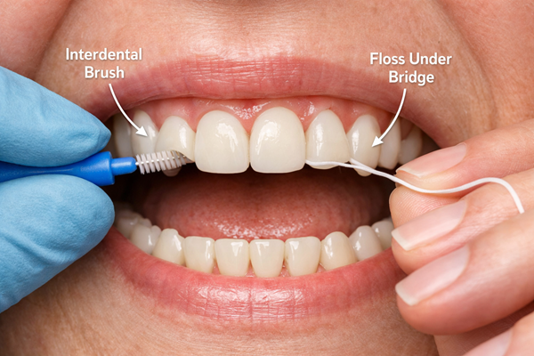 Brushing: Brush twice a day as usual, making sure to angle the bristles towards the gum line around the abutment teeth. A soft-bristled toothbrush is ideal to avoid unnecessary abrasion.
